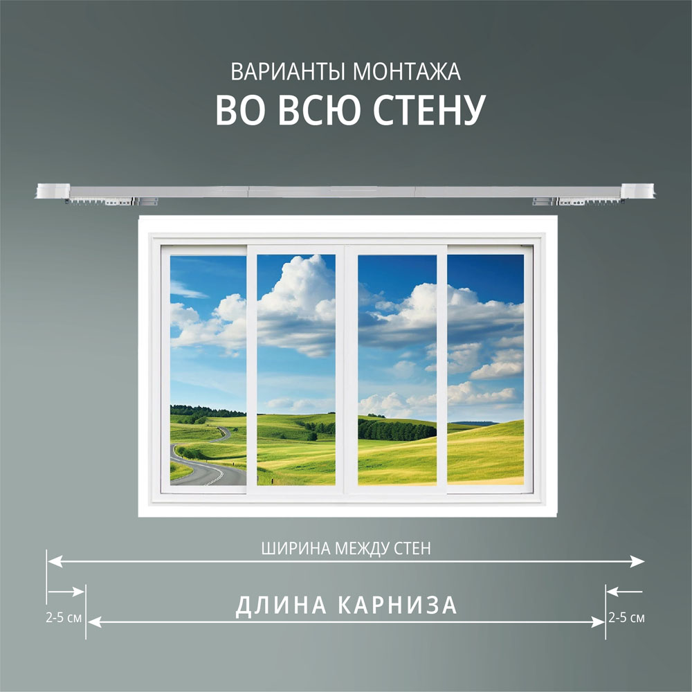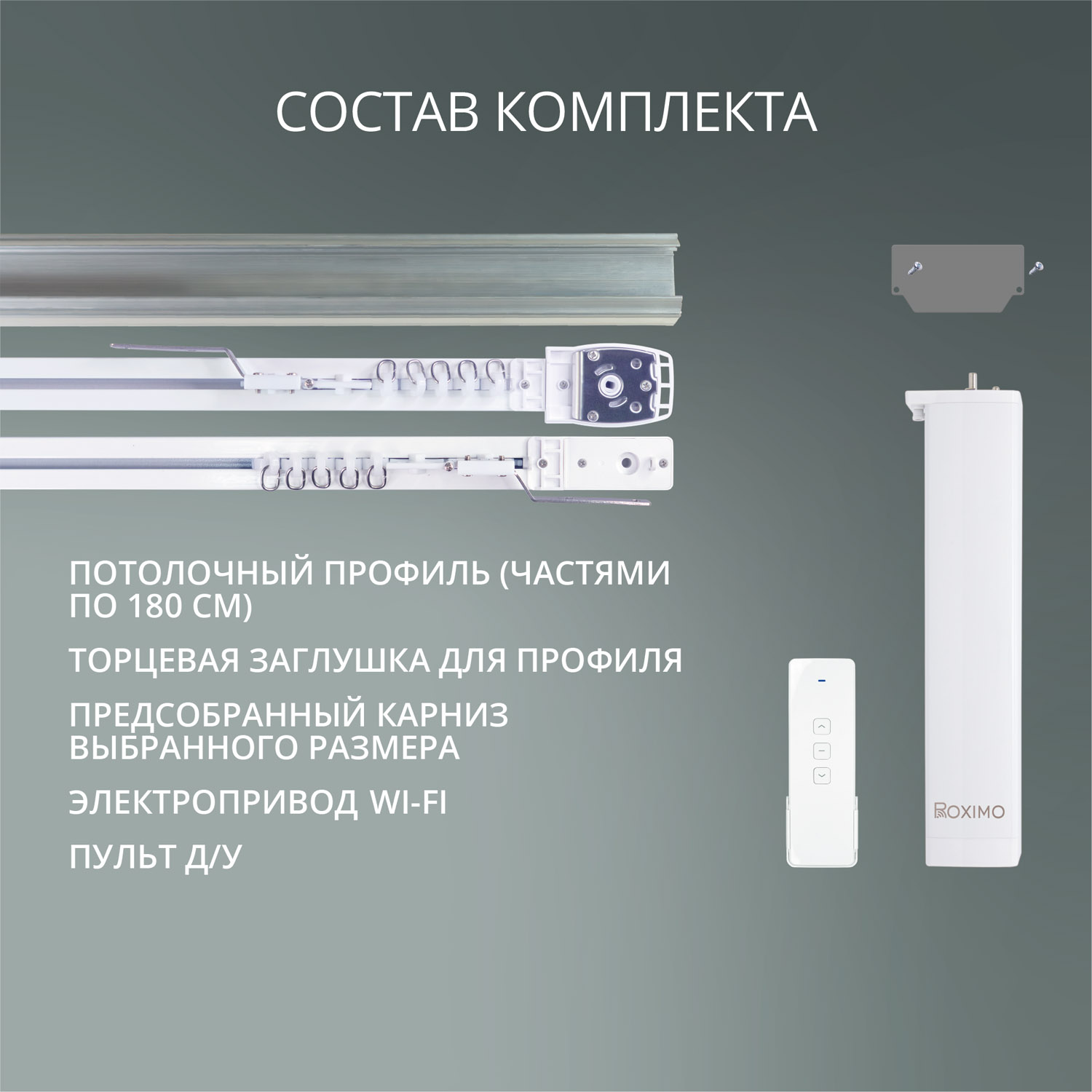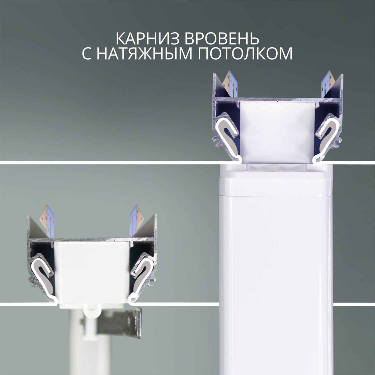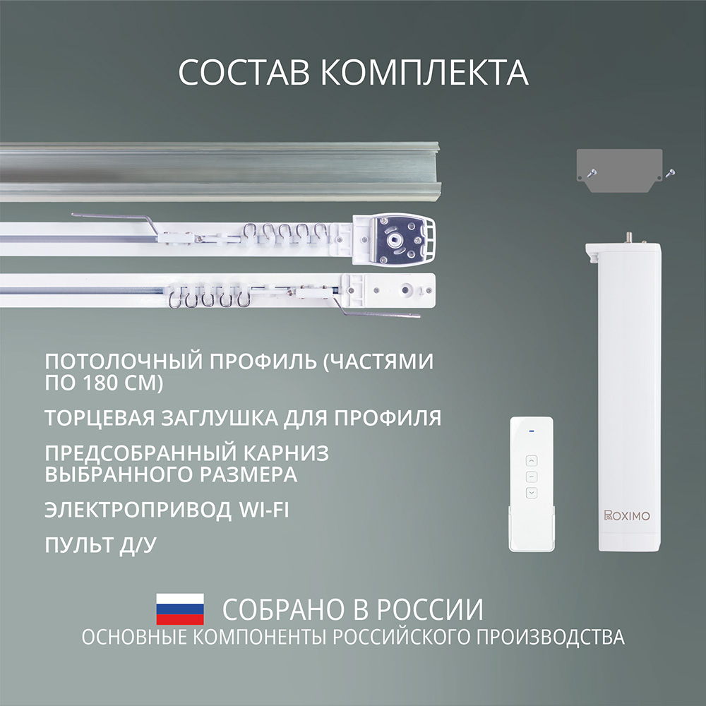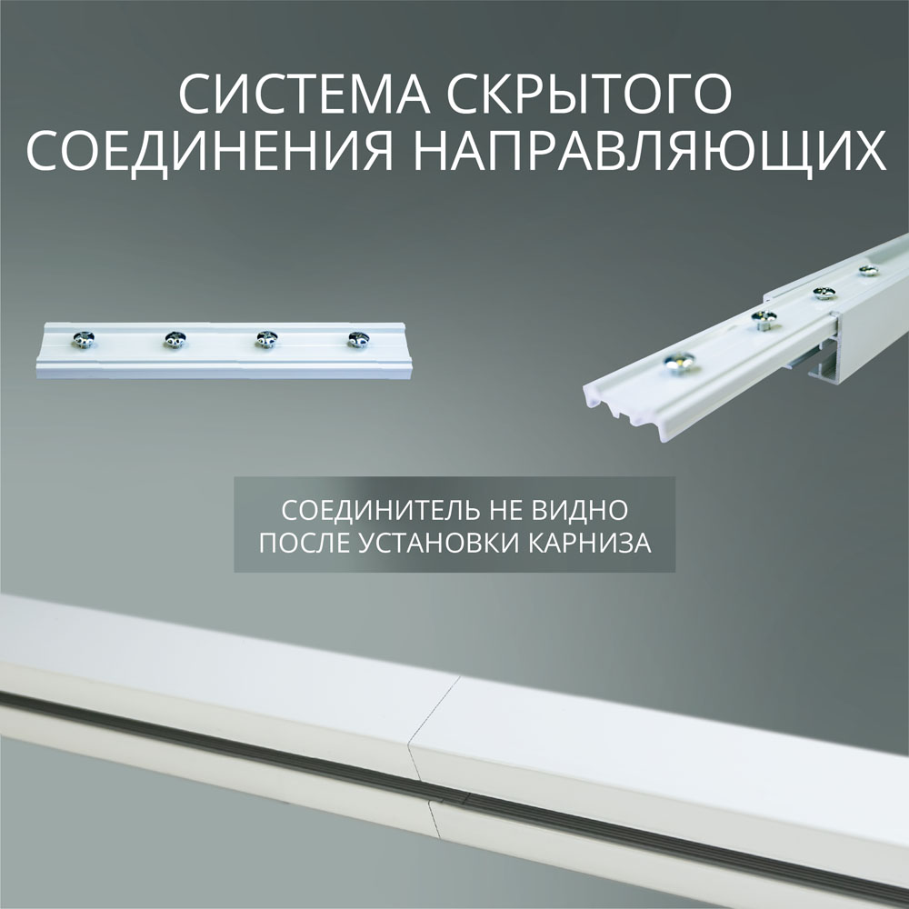 Комплект включает в себя специальные детали, такие как: закладной потолочный профиль и заглушки для него, специальные редукторы для электрокарниза узкого формата, соединители профилей и крепежные элементы. В результате электрокарниз вставляется в закладной профиль и составляет одну плоскость с натяжным потолком.